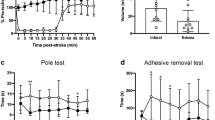 Open field test was performed between 08.00 am–02.00 pm. Mice were placed in the open field arena at the middle position of the hind wall (facing the wall). The locomotor activity of the mouse was automatically tracked for 20 min by using a light beam break ActiMot Box System (TSE ActiMot Version 08.00, TSE Systems, Bad Homburg, Germany) as previously described26. Prior to testing, light conditions were set to 200 lx in the middle of the arena.