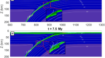 A possible mechanism for the development of this slab gap is the interaction of a spreading ridge with the active margin. Unambiguous elements to identify this process are forearc anatexis and MORB magmatism at the site of ridge-trench interaction known as the ‘blowtorch effect’58 due to direct mantle upwelling beneath this area and the emplacement of forearc ophiolites indicating forced subduction of buoyant and young oceanic floor23. In the case where mid-ocean ridges interact obliquely with the margin, ridge-trench triple junctions migrate along the subduction zone and the time-transgressive tectonomagmatic effects are a hallmark signature of spreading-ridge subduction23,46.
