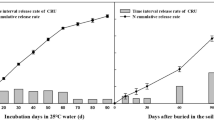 Nitrogen release rates of CRU were tested in a laboratory by incubating in 25 °C water43. In brief, 10.0 g of CRU sample were placed in a glass bottle containing 200 ml of distilled water with three replicates, and then kept in a constant temperature incubator at 25 °C. The solution samples were collected at 1, 3, 5, 7, 10, 13, 16, 19, 22, 28, 35, 42, 49, 56, and 63 days or when the cumulative N release rate was more than 80%. The released N content from the CRU was determined using the Kjeldahl method, followed by calculating rates of N release from the CRU.