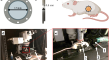Mice were irradiated with an X-RAD 225Cx small animal irradiator (Precision X-ray, North Branford, CT) using a 180° arc and 8, 10, or 15 mm diameter collimators, depending on tumour size. The system was calibrated following the TG-61 protocol69 at 225 kV peak voltage. For image guidance and sizing of the tumors, T2MR images were acquired before irradiation as determined using the pre-irradiation MRI acquisition. The mice were then transferred to the X-RAD and re-imaged using the integrated CBCT imaging system. The two image sets were registered to assure precise alignment of the treatment fields with the target70. Collimators were chosen to give a \(\gtrsim \)2 mm geometric margin, ensuring coverage of the target in the presence of residual setup uncertainty. One treatment plan was generated for each collimator and prescription dose (7, 8, or 9 Gy per fraction for 5 fractions), with dose-rate/beam-on time specific to the collimator and prescription. Individual treatment plans for each animal were not created; the treatment plan assumed a generic animal size and anatomy. An example dose distribution calculated using SmART-Plan71 is shown in Fig. 1a,b.