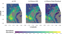 Figure 2B shows a linear regression slope between the column-averaged and surface methane mixing ratios of 0.053. This value is much lower than one, because methane is only enhanced in a shallow boundary layer. Assuming a tropopause altitude of ~10 km and a surface altitude of 1.5 km, this implies that methane accumulates in a layer of ~450 m thick (0.053 × 8500 m). This layer height is in the range of previous observations in the basin. During cold-pool conditions, the height of the polluted layer is lower initially (200–300 m)26 but can grow as cold-pool conditions persist and emissions gradually mix to higher elevations. Deeper boundary layers of more than ~1500 m were also observed in the winter in the absence of cold-pool conditions11. More insight into the altitude distribution of the methane is obtained by plotting the column average mixing ratios of methane observed on a single day, 9 December 2018, as a function of the surface pressure, i.e. elevation (Fig. 2C), with the location of the columns shown in Fig. 2D. In the absence of local emissions, the column-averaged methane mixing ratios do depend slightly on surface elevation, which may explain the observations outside the basin, but the much stronger altitude dependence inside the basin can only be attributed to the build-up of methane in a shallow layer. This analysis also suggests that the depth of the layer with enhanced methane is ~50 hPa or ~500 m. It should be noted that the Uintah basin was snow-free on 9 December 2018 (Fig. 2D), so the inversion may not have been strong and the mixed layer deeper than during cold-pool conditions28.