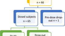 The mean plasma concentration versus time plot obtained after oral administration of 150 mg Eperisone as immediate release (A, reference) and osmotic dosage form (B, test) in 12 healthy human volunteers (fasted state) are shown in Fig. 6. Pharmacokinetic characteristics of Eperisone as summarized in Table 5 were obtained by non-compartmental analysis using PK software Kinetica version 5.1. The Cmax, Tmax, AUC0-∞, Cl/F and Vz/F for immediate release tablets containing 150 mg Eperisone (as shown in Table 5) were 7.65 ± 1.28 ng/ml (5.80–9.95 ng/ml), 1.02 ± 0.24 h (0.75–1.50 h), 20.88 ± 1.33 ng/ml × h (18.96–23.58 ng/ml × h), 7211 ± 450 L/h (6361–7911 L/h) and 18800 ± 1690 L (16815–22755 L), respectively. Whereas, in case of osmotic tablets containing 150 mg Eperisone the Cmax, Tmax, AUC0-∞, Cl/F and Vz/F were found to be 3.46 ± 0.33 ng/ml (2.95–4.01 ng/ml), 4.83 ± 1.21 h (3–6 h), 22.91 ± 1.67 ng/ml × h (19.39–25.22 ng/ml × h), 6585 ± 522 L/h (5948–7735 L/h) and 18982 ± 2491 L (15054–24100 L), sequentially. The AUC0-t, t 1/2λz and MTT of Eperisone obtained after ingestion of immediate release tablets as shown in Table 5 were found to be 22.67 ± 1.32 ng/ml × h (18.69–23.34 ng/ml × h), 1.81 ± 0.09 h (1.67–1.99) and 2.94 ± 0.26 h (2.56–3.39), respectively. The AUC0-t, t1/2λz and MTT of Eperisone obtained after ingestion of osmotic tablet as shown in Table 5 were found to be 22.85 ± 1.67 ng/ml × h (19.32–25.17 ng/ml × h), 1.99 ± 0.15 h (1.69–2.17) and 7.24 ± 0.42 h (6.51–7.78), respectively. The relative bioavailability of test product (Osmotic pump) calculated on the basis of AUC0-∞ of test and reference (immediate release) products was 109.7%. Numerious PK studies of Eperisone were reported by different investigators. A PK study, reported by Jeoung et al. in which 100 mg Eperisone was administered as immediate release tablets (each tablet contains 50 mg) in fasted state. The study reported the values of Cmax, Tmax and AUC0-∞ as 1.25 ± 0.59 ng/ml, 1.28 ± 0.64 h and 4.21 ± 0.41 ng/ml × h, respectively16. Kim et al. reported that the Cmax, Tmax, AUC0-∞, Vz/F and Cl/F of Eperisone were found to be 11.8 (0.8–44.8) ng/ml, 1.0 (0.5–2.0) h and 31.3 (2.5–76.1) ng/ml × h, 115,152 (23,744–281,751) L and 11,477 (1,855–56,785) L/h, respectively after administration of 150 mg Eperisone as a single dose19. A study conducted by Tanaka reported the Cmax, Tmax and AUC0-∞ as 7.5–7.9 ng/ml, 1.6–1.9 h, 19.7–21.1 ng/ml × h, respectively after administration of 150 mg Eperisone as a single dose in fasted state21. Ryu et al. conducted a study in which Eperisone 75 mg as sustained release tablet was administered to each volunteer in fasted state and the values of Cmax, Tmax and AUC0-∞ were reported as 0.743 (0.117–7.67) ng/ml, 1.0 (0.3–6.0) h and 3.731 (1.17–37.00) ng/ml × h, respectively20. Several other studies also reported the pharmacokinetic characteristics of Eperisone after per oral intake. After analysing the results of different Eperisone PK studies, it was noticed that the PK variables like Cmax, AUC0-∞ and PK parameters like volume of distribution and clearance values of Eperisone showed a significant variation between the study results. Interpersonal PK variation was also noticed (specifically in case of Cmax) within a study even after administration of Eperisone as sustained release product. The Eperisone was found to undergo extensive first pass effect, resulting in reduced bioavailability. The interpersonal PK variation was supposed to arise due to variation in metabolic capability of every individual20,30. In the present study the results of osmotic tablets containing Eperisone showed Cmax in the range of 2.95–4.01 ng/ml. This indicates that the osmotic tablets were not significantly affected by the interpersonal variation in comparison to immediate release and sustained release tablets. The Eperisone release from the dosage form have an impact on its PK characteristics. In case of immediate release tablet whole amount of Eperisone will be liberated in a short span of time as compare to osmotic tablets. As Eperisone undergoes extensive first pass effect, the amount of Eperisone available for metabolism and the quantity of metabolic enzymes will affect the pharmacokinetic characteristics of the drug. As the quantity of enzymes (metabolizing Eperisone) is limited so the amount of Eperisone exposed to enzymes may affect the extent of first pass metabolism. Hence, interpersonal PK variation was observed either due to variation in the quantity of Eperisone metabolizing enzymes or rate of Eperisone release from the product20. In the present study AUC0-∞ of Eperisone for osmotic tablets and immediate release was in the range of 18.96–25.22 ng/ml × h. The relative bioavailability of test product was 109.7%. The Tmax of immediate release product as shown in Table 5 is around 1 hour, indicating quick absorption of drug. Whereas, a delayed Tmax (3–6 hours) in case of osmotic pump was observed due to the slow and controlled release of drug from the product. The t1/2λz of immediate release tablets and osmotic tablets as shown in Table 5 were found to be 1.81 ± 0.09 h (1.67–1.99) and 1.99 ± 0.15 h, respectively. Jeoung et al. conducted a PK study in which 100 mg Eperisone was administered and the t1/2λz was reported as 3.16 ± 0.41 h. Most of the PK studies involving Eperisone reported the t1/2λz in the range of 1.6–2.0 hours. The MTT of Eperisone was greater in case of osmotic pump (7.24 h) due to prolong release from the product as compared to the (2.94 h) immediate release product.