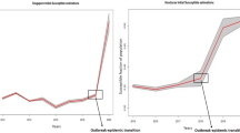 Bootstrapped confidence intervals were computed. For each predicted \(\widehat{\mu }\) of a model, we generated 1000 samples of outcomes from a Poisson distribution with the rate parameter equal to the estimated parameter (\(\widehat{\mu }\)) of that fitted model. Based on these 1000 simulated outcomes, we refitted the model 1000 times to obtain the distribution of the parameter’s values. The 95% confidence interval defines a range of values between the 97.5% and 2.5% quantiles. We considered the model to be satisfactory if it managed to successfully predict the two major outbreaks (within confidence intervals) in 2002 and 2018 in the LOOCV process and if it produced relatively low values for MSEva or MSEratio (defined as MSEva/MSEtr). The Normalised Mean Squared Error (NMSE) was also calculated by dividing the MSE of the validation or training set by the range of the observed variable.