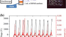The device used for the experimentation and its diagrammatic illustration was mentioned (Fig. 1a,b). The electrical characteristics (recorded with Lecroy wavesurfer 434, 350 MHZ oscilloscope using Tektronix P6015A high voltage probe and Tektronix P6022 current probe) for the soft plasma jet operated with air and nitrogen gas are shown in Fig. 1d,e. The flow rate of both gases was fixed at 1.5 liters per minute. Plasma was generated in dimming mode by using a DC to AC inverter whose operational time (Ton) and shutting time (Toff) were 13.71 ms and 114.80 ms (Fig. 1c). The duty percentage was ~11%. A long shutting of time (~90% of the total duty cycle) was essential in order to prevent heating of the plasma jet and enable longer operational duration. The current and voltage waveforms recorded during the Ton period of the circuit are shown in Fig. 1d,e for air and nitrogen gas respectively. For both air and nitrogen gas, the voltage waveforms appear distorted during each positive and negative half cycle of the applied voltage. The frequency of the source is ~70 kHz. The dissipated power (P) during the discharge was estimated by integrating the voltage (V(t)) and current (I(t)) signals recorded at each time points (t) over one time period (T) of the duty cycle as Kim et al. 2019,