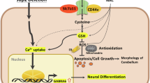 Reactive oxygen species (ROS) are formed mainly through the reduction of oxygen in mitochondria. ROS include oxygen radicals and some non-radical oxygen derivatives such as hydrogen peroxide (H2O2), O3, and singlet oxygen1,2. ROS are also implicated in the progression of neurological diseases, including Alzheimer’s and Parkinson’s diseases, and stroke-related dementia3,4,5. The cerebellum is the most vulnerable part of the brain to developmental abnormalities after exposure to oxidants6,7. In the cerebellum, ROS exert a wide variety of actions, which range from involvement in cell proliferation to cell death, according to the “determination rule” of cell fate1. Understanding these actions of ROS during neuron development may help provide new information about the pathogenesis of neurological diseases. Intracellular ROS activity depends on the equilibrium between ROS generation and the activities of the antioxidant systems. Intracellular glutathione (GSH) scavenges a variety of ROS and is an obligate substrate of glutathione peroxidase for detoxification of H2O28. The ratio of reduced GSH to oxidized glutathione disulfide (GSSG) is an important determinant of the intracellular redox state and redox signalling9. The biosynthesis of GSH is regulated by several genes including those encoding members of the cystine–glutamate antiporter (Xc–) system, which includes solute carrier family 7, member 11 (Slc7a11)10,11,12 as the transporter subunit and solute carrier family 3, member 2 (Slc3a2 or CD98 or 4F2) as the binding partner13,14. The Xc– system is a sodium-independent antiporter of cystine and glutamate that traps extracellular cystine in exchange for intracellular glutamate at a 1:1 molar ratio15. CD44v16 has been reported to be a positive regulator of Slc7a11 by recruiting OTUB1, an ovarian tumour family deubiquitinase17, which decreases the sensitivity of cancer cells to oxidative stress and ferroptosis18. Intracellular cystine is taken up by the Xc–system and reduced to cysteine, which is consumed during protein synthesis and finally to produce GSH, an important factor in redox balance10.