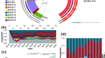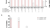 CC5 (S. aureus: 44/120, 36.7%; MRSA: 37/53, 69.8%) was the dominant clone among patients with SAB at Ruijin Hospital in Shanghai from 2013 to 2018 in this study, slightly different from our previous research conducted in Shanghai from 2009 to 2011 that CC8 (ST239) might be more common among patient with SAB before27. However, shifts may be occurring in the molecular epidemiology of S. aureus and MRSA among patients with bloodstream infections. As reported from a single-center surveillance in Greece, the widespread HA-MRSA clone ST239-III gradually decreased with the increase of the isolation frequency of these two CCs: HA-MRSA CC5, mostly belonging to ST5-II; and community-associated MRSA (CA-MRSA) CC80, mainly represented by ST80-IV-t04419. In this study, CC5- II MRSA was found in 34 isolates accounting for 91.9% (34/37) among CC5 MRSA isolates, suggesting that CC5 MRSA or CC5-II MRSA might be more frequent occurring among patients with MRSA BSIs in Shanghai. It has been suggested that CC5 has become an increasingly frequent cause of MRSA infections as well as bacteremia acquired by hospitalized patients from some other reports and that healthcare exposure is no longer a discriminator of USA100 vs USA300 infections28,29,30. An analysis of SAB conducted in Spain over 15 years (2002–2017) revealed that CC5 was the most prevalent CC and the proportion of CC5 among healthcare-associated S. aureus isolates was higher than that among community-associated S. aureus isolates, and CC5 was much more associated with methicillin resistance4. Simultaneously, CC5 MRSA was also prevalent in bloodstream infections in nine Latin American countries except in Colombia and Ecuador29. Clonal substitution appears to be a common phenomenon, and continuous surveillance is essential to identify molecular epidemiological changes in S. aureus and MRSA.