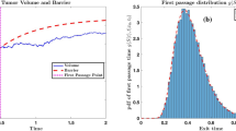 In panels (c) and (d) of Fig. 3 we show the same quantities, but for a different choice of birth rate (see Table 3). The deterministic path barely crosses the boundary \(\ell \), and for this choice of parameters only a fraction of trajectories of the stochastic model will lead to an onset of NTC. In this case, the predictions of the two approximations are widely different. Approximation 1 assumes a Gaussian distribution of first-passage times and deviates significantly from the NTCP seen in the original model. Most notably, this approximation predicts that all trajectories eventually cross the boundary so that NTCP(t) → 1 at large times. Although this is not the case for typical population size used in this example (M = 1000), we remark that for M → ∞ NTC becomes certain at long times in the original model for the present parameter set.