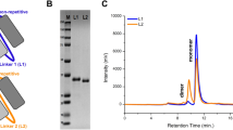 The synthesized gene was cloned into maltose-binding protein (MBP), encoding a plasmid vector, pDEST-periHisMBP (Addgene, 11086, Cambridge, MA, USA)62, by gateway cloning63. The BP reaction was carried out with BP Clonase™ II Enzyme mix (Invitrogen, Carlsbad, CA, USA) and pDONR221 (Invitrogen) as a donor plasmid. The proteinase K was added and, recombinant plasmids were transformed into DH5α and selected on the LB agar plates containing kanamycin (50 μg/mL). To produce expression clones, additional recombination was performed by LR Clonase™ II Enzyme mix (Invitrogen) with entry clones and pDEST-periHisMBP. After addition of proteinase K, the expression clones were transformed into DH5α and selected on LB agar plates containing ampicillin (50 μg/mL) selection medium. The expression clone, named pPHM-F7-di-scFv (Fig. 5A), was analyzed by a DNA sequencing service (Macrogen, Seoul, Republic of Korea). Bivalent F7 scFv protein was expressed in BL21 (DE3) pLysE cells (Merck). An expression test was then carried out as for the protein A fusion clone. For purification, the supernatant products of scFv expression were applied to a nickel-nitrilotriacetic (Ni-NTA) agarose column (Thermo Scientific, Waltham, MA, USA)64. SDS-PAGE (10%) was performed to identify and separate proteins. Western blot analysis was conducted as described by65 using primary anti-His tag mouse monoclonal antibodies (1:5000; R&D systems, Minneapolis, MN, USA) and HRP-conjugated secondary anti-mouse IgG (Cell Signaling Technology) to detect target proteins.
