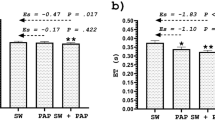 All correlation coefficients between thrust variables were significant with a strong association, except the pairwise mean thrust vs. peak thrust in PAP that was non-significant but yet on the lower limit of a strong association (Table 2). Pooling the data (i.e. merging PAP and non-PAP datasets) the association between mean thrust and peak thrust was R = 0.69 (P < 0.001), between mean thrust and thrust-time integral R = 0.86 (P < 0.001), and between peak trust and trust-time integral R = 0.77 (P < 0.001). Hence, there is a significant and strong association among different kinetic variables, albeit the proportion of the variance is about 50–75% for pooled data.