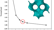 We can conclude that the computed frequencies of our models range from \({f}_{single}^{sphere}=5352\,Hz\) to \({f}_{single}^{sphere}=7621\,Hz\) depending on the proximity of the boundaries. Packing the cellular structure with three multiple layers of ceramic spheres would give \({f}_{grid}^{sphere}=5961\,Hz\), which is likely to be in line with the fundamental frequency of our metamorphic material, ‘Proteus’. Interestingly, a multitude of higher modes of vibrations is also possible, because they are closely spaced, with frequency gaps in the range of hundreds of Hz only see (Fig. 19).
