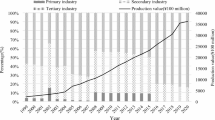 Total energy demand is composed of the energy consumption from the industry, transportation, and residential sectors60. Transportation, warehousing, and postal services are considered as mobile sources, which are calculated in the transportation sector61, differing from those of the terminal energy consumption in the industry. Energy consumption of the production can be derived as the amount of the energy consumption from the primary, secondary, and tertiary industries as well as their energy intensity (Fig. 3). Energy intensity can be calculated as energy consumed per unit of GDP, reflecting that the industrial energy consumption rely on economic development and technology innovation27,62,63. Based on the 1998–2015 data, energy intensity is measured (Appendix A). Energy consumption from the industry sector is calculated as below: