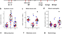 Three different E. coli strains were used for the intra-mammary challenge: VL2874 (isolated from per-acute mastitis), VL2732 (isolated from persistent mastitis) and P4 (widely used as model strain for mammary pathogenic E coli, isolated from clinical mastitis in the UK). Strains typing, phenotypic and genomic characteristics were extensively studied and described before2,7,8. Bacteria were recovered from frozen stocks (kept at −80 °C in a mixture of brain-heart infusion and 25% glycerol) on blood agar (Tryptose Blood Agar Base; Becton-Dickinson, Sparks, MD, USA, with 5% washed sheep erythrocytes) and incubated aerobically at 37 °C overnight. For inoculum preparation, bacteria were harvested and washed in pyrogenic-free saline (PFS), suspended in PFS and stored at 4 °C for 10 h. Aliquots were taken for colony forming units (CFU) count on blood agar. CFU number was adjusted with PFS right before challenge, aiming to an inoculum of ~50 CFU in 3 mL. Final CFU number in the inoculum ranged from 10–30 CFU/gland, as determined from aliquots separated just prior to challenge. The small CFU counts in the inoculum aimed to better represent a natural infection in which it is expected that only a small number of bacteria enter the mammary gland and initiate the infection.