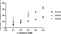The reaction mixtures were set-up in quartz microcuvettes (10 mm light path) and were composed of 5 mM L-amino acid, except for the L-aromatic amino acids the concentration of which was 0.5 mM, 10 mM neutralized semicarbazide-HCl, catalase, 6.6 μg/ml, snake venom L-amino acid oxidase [Sigma cat #A9378, 8–50 µg/mL), or L-glutamate oxidase (Sigma cat# G-5921) or L-aspartate oxidase (a kind gift of Prof. Armando Negri and Gabriella Tedeschi, University of Milan) and different amounts of RidA enzymes in 50 mM sodium pyrophosphate buffer, pH 8.725. The amount of the L-amino acid oxidase was adjusted in order to have similar rates of formation of IA with the different L-amino acids (~ 0.2–0.3 ΔA248/min). The reaction was started by the addition of the L-amino acid and monitored as described in25. The time-course of formation of the semicarbazone species was monitored as the increase of absorbance at 248 nm. The initial reaction velocity measured in the presence of a given concentration of RidA (vRidA) was then expressed as percent of the initial velocity measured in the absence of RidA (vo). The resulting residual velocity (v) values were then fitted with equation (1) using the GraFit 4.0 software (Erythacus Software Ltd) to calculate the K50 value and the associated error25.