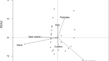 To determine if beetle and ant communities were significantly correlated, we used PC-ORD25 to conduct both Mantel tests and partial Mantel tests. Following Smouse et al.27, partial Mantel tests include a third matrix to control for environmental variables (treatment, time, diameter, tree and termite incidence). The same modified matrices used in the NMDS analyses (see above) were tested first and these results were compared with those based on unmodified matrices. The Jaccard distance measure was used for ant presence/absence data and the Bray-Curtis distance measure was used on beetle abundance data. To examine the relationship between the richness of beetles and ants, we ran a mixed model consisting of beetle richness as the response, ant richness and time as fixed effects and tree (1–12) as a random effect. Finally, to look at pairwise associations between insect species sampled in this study, we performed co-occurrence analysis using the package cooccur28 in R 3.6.129. Beginning with a complete matrix of all 259 species and 110 logs, only species pairs with an expected co-occurrence ≥ 1 were retained for analysis with expected co-occurrence being the product of the two species’ probability of occurrence times the number of sampling units28. For each of these retained pairs, the function returns probabilities that the two species could co-occur less than or greater than what is observed in the data. Following Griffith et al.28, these are reported here as P-values, indicating significance levels for negative and positive associations, respectively. To visualize these patterns, observed-expected plots28 were prepared for five pair combinations: termite × ant, ant × ant, termite × beetle, ant × beetle and beetle × beetle. When one of these pair combinations contained more than ten significant associations, a Chi Square test was used to determine if the relative number of negative and positive associations differed significantly from a 1:1 ratio. This test was also performed on all significant associations combined.