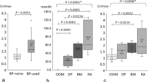 We calculated each patient’s aSUVmax and metabolic bone volume (MBV) before and after the anti-inflammatory treatment using GI-BONE and the previously mentioned equation (Tables 1 and 2). Additionally, the transition line graph and box-and-whisker plot of aSUVmax and MBV before and after the anti-inflammatory treatment of each patient are shown (Figs. 2 and 3). The overall aSUVmax was significantly reduced after the anti-inflammatory treatment. The mean aSUVmax of the 1st/2nd time of SPECT = 11.5 ± 5.9/9.2 ± 3.9 (p = 0.04) (Fig. 2).