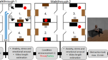 The temporal organisation of each block was as follows (Fig. 1b): a black screen with the written instruction “stabilisation of the signal” was first presented for 1 min during which the physiological baseline of participants was recorded. Second, to inform participants about the nature of the block, the written instruction “Threat Block: at any time, a scream can be presented” or “Safe Block: you will hear nothing during this block” was presented for 10 s. Third, participants performed the above-described free action-task for about 4 min. Fourth, at the end of each block, participants reported their anxiety level on a continuous scale (from 0: really calm to 100: really anxious), by moving a cursor on the screen using the mouse. The scale was presented on the computer screen and disappeared once the response was given. Finally, to assess physiological variation of participants’ bodily state in threat compared to safe blocks, skin conductance activity was recorded throughout the blocks.