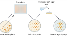 For the library screening, 95 single colonies were randomly picked up from each configuration for downstream analysis. Freshly transformed colonies were resuspended in 500 μl of auto-induction medium (93% ZY medium, 0.05% 2 M MgSO4, 2% 50 × 5,052, 5% 20 × NPS) in a 96 deep-well plate and incubated at 37 °C for 5 h, followed by 16 °C for 40 h, both at 900 rpm. Cells were spun down by centrifugation (3,200 × g, 30 min, 4 °C) and the supernatants were removed. Cell pellets were lysed by exposure to chloroform vapor, by placing the deep-well plate upside-down in a glass petri dish containing chloroform-saturated filters for 2 h. Cell lysates were resuspended in 20 mM HEPES–NaOH (pH 7.4), and 1 U DNase I, followed by incubation (100 × rpm, 1 h, 30 °C). The lysates were investigated by SDS-PAGE analysis to confirm the protein expression, but protein yield could not be accurately quantified. Insoluble fractions of cell lysates were removed by centrifugation (3,200 × g for 30 min, at 4 °C) and the cleared lysates were screened for both muralytic and inhibitory activities.