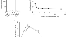 where \({V}_{\mathrm{NaOH}}\) is the volume (mL) of the NaOH solution required to neutralize the released FFAs, \({m}_{\mathrm{NaOH}}\) is the molarity (M) of the NaOH solution, \({M}_{\mathrm{Lipid}}\) is the molecular weight (0.7 × 891.48 + 0.3 × 470.69 = 765.24 g mol−1) of the lipid mixture (TS and TC), \({w}_{\mathrm{Lipid}}\) is the total weight (0.1 g) of the lipid mixture initially present in the reaction vessel, and \({N}_{\mathrm{FFA}}\) is the expected number of FFA produced from a triacylglycrol (hepatic esterase, 1; pancreatic lipase, 2). Blank experiments were also conducted with heat-inactivated enzymes (95 °C, 15 min) to eliminate any pH decrease due to other factors. Calculated values for \(\mathrm{\%FFA}\) were fitted using regression curves as follows53: