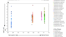 where Aij is a measure of specificity that represents species abundance in a given habitat with respect to the total number of collected species, and Bij is a measure of fidelity that represents the number of habitats where the species is present with respect to the total number of habitats considered44,45,46. A and B are multiplied because they represent independent information about species distribution. The indicator values range from 0% (no indicator) to 100% (perfect indicator). Species with significant (P < 0.05) results above 70% were considered indicator species whereas species with an intermediate IndVal value, between 45 and 70%, were considered detector species. Indicator species are characteristic of a particular habitat and may decline rapidly under changing ecological conditions. Detector species exhibit a different degree of preference for different habitats and relative changes in their abundance among habitats might indicate the direction in which change is occurring46. We performed this analysis using PC-Ord 547. Considering the IndVal results (Supplementary Table S2), we selected three native forest species, eight agroforestry parkland species, and three open pasture species (Table 1).