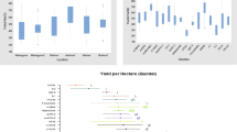 In 2018, yield data were subjected to a combined ANOVA for genotype, environment, and G × E interaction with location, production system, replications, and genotypes as random effects. The percentages of G, E, and G × E sum of squares of the total variation were estimated to evaluate the magnitude of variation contributed by each factor. Least squared means and significance (based on Tukey’s adjustment for multiple mean comparisons) were computed for each trait for each genotype and environment. When significant G × E was detected for a specific response, stability analysis was carried out with estimation of univariate stability indexes and multivariate stability statistics based on genotype plus genotype by environment interaction approach (GGE biplot). The SASG x E program developed by Dia et al.35 was used to compute the univariate stability coefficients including the regression slope (\({b}_{i}\)), deviation from regression (\({S}_{d}^{2}\)), and Shukla’s stability variance (\({\sigma }_{i}^{2}\)). Also, the GGE biplots analysis was carried out using the ‘GGEBiplotGUI’ package of R statistical software36,37. This graphical analysis mainly involved (i) mega-environment analysis (“which-won-where” pattern of GGE biplot), (ii) genotype evaluation (mean vs. stability analysis, genotypes ranking with “ideal” genotype), and (iii) testing environment evaluation (especially, discriminating power of environments, ranking of genotypes in specific environments).
