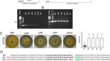 We first assessed editing by screening P. tricornutum exconjugants by T7 endonuclease I (T7EI) mismatch cleavage assays on PCR products amplified from each target gene (Figs. 1B, 2B, Table 1). This assay identified 6 sgRNAs with detectable editing rates based on screening of exconjugants. Colonies that showed editing were diluted, plated to obtain subclones, and subsequently screened for the corresponding auxotrophic phenotype on solid media with and without auxotrophic supplement (uracil or histidine) (Figs. 1C, 2C). To cure the Cas9-editing plasmids, knockout strains were grown without zeocin selection for 1 week, and dilutions were plated to obtain single colonies. Colonies were streaked onto L1 plates with and without zeocin to screen for plasmid loss. A representative image demonstrating zeocin sensitivity due to loss of the Cas9-editing plasmid is shown in Fig. 1D. For knockout of the PtUMPS gene, we further characterized 3 subclones with a uracil-requiring phenotype to determine if the knockouts were monoallelic or biallelic. Because the two PtUMPS alleles of P. tricornutum possessed SNPs relative to each other, we were able to map allele-specific editing events (Fig. 1E,F). Two of the strains, \(\Delta\)UMPS1 and \(\Delta\)UMPS2, were biallelic and exhibited loss of heterozygosity with one allele possessing a small deletion (< 20 bps) and the other allele possessing a large deletion (> 610 bp). The third characterized subclone, \(\Delta\)UMPS3, was monoallelic and possessed a homozygous 1-bp insertion. For the PtPRA-PH/CH knockouts that generated a histidine-requiring phenotype (Fig. 2B,C), targeted sequencing of one subclone revealed a biallelic genotype with an 11-bp deletion in one allele and a 6-bp deletion in the second allele (Fig. 2D,E).
