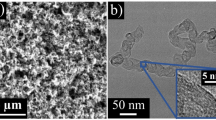 The electrolyte composition can affect the CNT diameter. Figure 3 presents SEM of the thinnest 4 h grown CNTs that had been observed. This is accomplished by addition of low concentrations of lithium oxide to the electrolyte. The CNTs are electrosynthesized in 770 °C Li2CO3 with 2 wt% Li2O electrolyte (0.67 mol of Li2O per kg Li2CO3) using a nickel alloy anode and brass cathode. At the relatively low current density of 0.1 A/cm2 applied (aluminum smelting by electrolysis of aluminum oxide typically occurs at 0.5–0.6 A/cm2), CO2 from the air (direct air capture) is sufficient to renew the electrolyte in accord with Eq. (3) and maintain the electrolyte level in accord with Eq. (1), and concentrated addition of CO2 is not required and not added. Nickel chromium alloy anodes and brass cathodes have been shown to be particularly stable for repeated use in CO2 splitting by molten carbonate electrolysis21. After the synthesis, the extracted cathode is cooled and the solid product readily is peeled off the cathode and washed to remove excess electrolyte prior to microscopy. Panel B of Fig. 3 is of interest as it constitutes SEM of a product removed from the rear side (not facing the anode) of the cathode. In particular, a piece of the multilayer graphene sheet which first forms on the cathode, and from which the CNTs growth is evident in a manner consistent with the tip growth mechanism presented in reference 3. The product is ~ 98% uniform CNTs as determined by visual inspection of multiple SEMs and TEM. Repeat experiments using the 2 wt% Li2O in Li2CO3 electrolyte, the coulombic efficiency was consistently 97% to 100%. Lower concentrations of lithium oxide resulted in thicker diameter and CNTs, and greater than 2 wt% added lithium oxide did not further decrease the observed CNT product thickness. The diameter of representative samples of the CNTs was measured with the nano-caliper function of the Phenom SEM and varied from ~ 50 to 80 nm, or approximately half the diameter of CNTs electrosythesized in pure Li2CO3 without added Li2O.