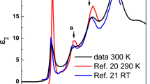 Spectroscopic ellipsometry has proved to be an effective tool for non-destructively characterizing the optical properties of monolayer TMDs17, providing critical information about the refractive index, extinction coefficient, and thickness of thin films18. Using spectroscopic ellipsometry, Yim et al.19 measured the optical properties of \({\text {MoS}}_2\) thin films at room temperature for several thicknesses (1.99–19.88 nm). They proposed a model for optical dispersion from which the optical constants and the film thickness values were obtained. They pointed out that thinner \({\text {MoS}}_2\) films have larger band gap energy. Eichfeld et al.20 examined the optical properties of ultrathin \({\text {WSe}}_2\) films (2–35 nm) at room temperature using spectroscopic ellipsometry. They stated that the refractive index and extinction coefficient are independent of thickness. In this study, the indirect optical band gap energy of \({\text {WSe}}_2\) was closely correlated to its thickness. Park et al.21 presented the temperature dependence of the dielectric function of monolayer \({\text {MoS}}_2\) obtained using spectroscopic ellipsometry. They calculated ten distinct energies in the dielectric function as the critical-point structures, in which the critical-point energy is defined by the second derivatives of the dielectric function. The temperature dependence of the critical-point energies was fitted to a phenomenological expression containing the Bose–Einstein distribution function. Recently, Choi et al.22 reported the temperature dependence of band gap in \({\text {MoSe}}_2\) ultrathin films, also through the use of spectroscopic ellipsometry. The band gap decreases linearly with an increase in temperature, which is explained by the vibronic model23. Diware et al.24 studied the complex dielectric function of monolayer \({\text {WSe}}_2\) using spectroscopic ellipsometry. They found that monolayer \({\text {WSe}}_2\) has an indirect band gap of 2.26 eV and direct band gap of 2.35 eV. Binding energies of A and B excitions were estimated to be 0.71 and 0.28 eV, respectively. Park et al.25 measured the temperature dependence of the dielectric function of monolayer \({\text {MoSe}}_2\) using spectroscopic ellipsometry. They observed six critical-point energies at room temperature and six additional structures at 31 K. All structures showed a blueshift and sharpened with a decrease in temperature as a result of the reducing lattice constant and electron–phonon interactions. More recently, Elliott et al.26 reported a joint ellipsometric and first-principles characterization of the surface susceptibility and conductivity of monolayer \({\text {MoS}}_2\) and \({\text {WSe}}_2\). They identified the excited exciton peaks in the ellipsometric spectra.