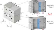 The performance of a sound absorber is typically characterised by the absorption coefficient as a function of the depth of the absorber in relation to the acoustic wavelength, \(\lambda \). For absorptive foams such as polyurethane or melamine foams, depths of between \(\lambda \) and \(\lambda /4\) are required to achieve significant absorption. As mentioned, acoustic metamaterials have provided a step-change in technological development by providing sound absorption with depths in the order of \(<\lambda /10\)9,10,11 in some cases. When noise reduction technologies are actually implemented for noise abatement, a sound absorber is used to cover a large surface or at least one whose area is many times the area of a unit cell of a metamaterial, and so a volumetric consideration reduces to a depth constraint. Our suggested metric for comparison between candidate technologies is then the linear average absorption in the chosen frequency range per unit depth. For reasons of brevity we will simply use the term average absorption to mean linear average absorption from here on in. This metric is closely related to the causality constraint of Yang et al.12 which gives the minimum depth of material that is required to achieve a desired absorption performance.