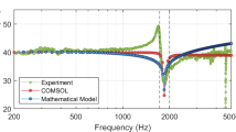 Figure 10b,c show that the magnitude of the differential pressure across the MPP, the magnitude of the differential displacement of the two membranes and the average \(V_\text {RMS}\) through the MPP are all closely related to each other and also to the corresponding absorption profile seen in Fig. 9. These plots support the physical premise of the SeMSA design: that the resonating membranes oscillating at either of two primary coupled frequencies, the frequencies of which can be lowered through the addition of platelets, create a pressure drop across the enclosed MPP. The pressure drop causes the enclosed air being pumped through the perforates from one chamber to the other resulting in a dissipative loss in the boundary layer of the holes when they are correctly sized.