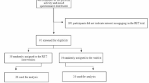 Inclusion criteria were: (1) age 18–40y; (2) not meeting criteria for AGAD; (3) no medical contraindication to safe participation in RET; and, (4) no current pregnancy or lactation. Young adults were recruited because the median age of onset of GAD is 30 years18. Current RET involvement at baseline was not an exclusion criterion. Participants were not excluded if they were in treatment for anxiety or other mental health disorders. Participants’ previous self-reported RET involvement was measured in weeks. Participants in both groups were advised to maintain their current levels of physical activity throughout the trial. Participants were not compensated. Based on previous meta-analytic evidence of the small-to-moderate effect of RET on anxiety (Δ = 0.31)5, a priori power analysis with G*Power 3.1 indicated a sample size of 24 (12 in each group) would provide > 80% statistical power (two-tailed α = 0.05, four repeated measures) to detect a small-to-moderate effect of RET on anxiety symptoms.