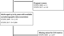 Missing values (Supplemental Table 1) were assumed to be missing at random and were imputed using multiple imputation using the aregImpute algorithm54, which uses predictive mean matching with optional weighted probability sampling. We have used different imputed datasets: for the analysis of cross-sectional associations with the primary endpoint (blood pressure), for the analysis with cross-sectional associations with the secondary endpoints (blood lipids), and one for each prospective association with disease endpoints and mortality. In each imputation, we created 50 imputed, using restricted cubic splines (3 knots) and not assuming linearity, including all variables used in the final analysis. For prospective analyses, we have also included the Nelson-Aalen estimator58. There were no meaningful differences when comparing results obtained from the full data set with complete cases analyses in cross-sectional data (Supplementary Tables 3 and 4).