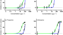 Haloxyfop belongs to the family of phenoxy herbicides and has been developed as a selective herbicide that is mainly absorbed through the foliage and roots of plants with subsequent hydrolysis to the acid, which is herbicidally active76. Haloxyfop inhibits the acetyl-CoA carboxylase (ACCase) enzyme that is involved in the synthesis of fatty acids76 and exists in two forms, the multi-subunit, prokaryotic (heteromeric) form and the multi-domain, eukaryotic (homomeric) form and in two locations (cytosol and plastid)77. Haloxyfop and other ACCase inhibitors target primarily the eukaryotic form of the enzyme rather than the prokaryotic form78. In the present study, both, SGR and ΔF/Fm′ of C. muelleri were nonresponsive to haloxyfop after 3-day exposure at the maximum concentration of 4570 µg L−1. In plants, both forms of ACCase enzyme have been described; however, some studies have indicated that certain microalgae, including some rhodophytes and chlorophytes, only contain the prokaryotic ACCase enzyme in their plastids77,79, possibly explaining the insensitivity of C. muelleri towards haloxyfop. There is only one other study on the toxicity of haloxyfop to marine phototrophs which reported a similar insensitivity in the marine cryptophyte Rhodomonas salina, with no inhibition of ΔF/Fm′ or SGR at the highest concentration of 3700 µg L−1 (Table 4). Additionally, there were chronic toxicity data for one freshwater chlorophyte, Scenedesmus subspicatus, which reported 4-day no observed effect level (NOEL) and EC50 (biomass yield, growth rate, area under the growth curve) values of 5000 μg L−1 and 106,000 μg L−1 , respectively54.