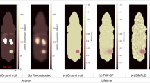 We also found an increase of up to ≈ 1% and 6% in the true and random counts, respectively, detected by the PET scanner in phantom vials containing 89Zr-SPIONs compared to 89Zr only (see Table 1). This can be attributed to the interaction of positrons within the Fe3O4 crystal structure of SPION cores resulting in annihilation via formation of ortho-positronium (o-Ps, in the triplet state, 3S1) and emission of three gammas23. Such triple-coincidences may be processed as a set of double coincidence events or detected as random counts by the PET scanner24. However, further investigation is required for more accurate quantification of o-Ps and para-positronium (p-Ps) productions in SPION dispersions. Since most of the clinical and pre-clinical PET scanners are not capable of detecting o-Ps as triplet coincidences, positron annihilation lifetime spectroscopy might be the best option for accurately measuring the o-Ps yield in SPION dispersions23. Figure 4a is a schematic diagram demonstrating the possible interactions of the emitted \(e^{ + }\) with the radiolabeled SPIONs in water. PET is based on registration of two gamma quanta originating from positron annihilation in tissue, where the most common (≈ 70%) annihilation route for a thermalized \(e^{ + }\) is direct annihilation with an \(e^{ - }\) (see Fig. 4b). The alternate route is via formation and decay of positronium (Ps)25. Ps can decay electromagnetically into two, three or more gamma quanta depending on the Ps quantum mechanical state just prior to annihilation25. Thus the energy of three annihilation photons has a continuum spectrum (with energies between 0 and 511 keV, with sum 1022 keV), due to energy and momentum conservation26 (see Fig. 4c). Due to spin statistics, 25% of all Ps are formed in the ground state (1S0) called para-positronium (p-Ps), while the remaining 75% form the triplet state (3S1), called ortho-positronium (o-Ps). In vacuum, o-Ps can only decay into at least three photons, and its lifetime (142 ns) is much longer than that of p-Ps (125 ps) or that of a free positron25,27. In water, due to the excess of oxygen atoms, the majority of o-Ps spins are inverted and thus the effective yield of annihilation quanta into three gammas approaches ≈ 1%28. The formation of o-Ps and the 3γ/2γ yield in materials can be significantly affected by open volume defects such as in the Fe3O4 crystal structure of SPION cores23,29. The lack of collinearity of the annihilation photons due to residual momentum of the \(e^{ + }\) or Ps at the time of decay can also impact the spatial resolution in PET imaging. A previous study30 showed that p-Ps decays in solution have significantly more Doppler broadening of the annihilation photons compared to o-Ps and thus significantly higher residual momentum in p-Ps at the time of decay. This indicates that noncollinearity of annihilation photons in our study is mainly contributed by p-Ps. In our experiment, the true and random counts measured for the four phantoms (Fig. 3a–d) increased with increasing [Fe] concentration. This suggests the increase in true and random counts (listed in Table 1) may be attributed to the interaction of \(e^{ + }\) with the crystal structure of SPION cores resulting in annihilation via formation of o-Ps (in the triplet state, 3S1) and decay into three gammas. Such triple-coincidences may be processed as a set of double coincidence events or a random event by the PET scanner, thereby incorrectly increasing the true and random counts detected by the PET scanner. Furthermore, the random counts recorded by the scanner for [Fe] = 3 mM is within 0.05% of the counts expected for a 6% increase in count rate relative to the [Fe] = 0 measurement. Furthermore, scintillators currently used in PET scanners, with an energy resolution that is typically worse than 15% at 662 keV and 35% at 340 keV, have low efficiency and sensitivity for detecting three annihilation photons (with a continuum spectrum)31. Nevertheless, triple coincidences may be identified by operating the scanner in LIST mode32. Another study has shown, with modifications in the acquisition electronics of a pre-clinical PET scanner, detection and processing of triple coincidences32. It would be interesting to follow up our study using emerging total body PET scanners, which with their superior sensitivity and 4π geometry are ideal for triple coincidence detection33. The novel Jagiel-lonian PET (J-PET) system9,28,34 has also been designed for detecting three gamma decay from ortho-positronium (o-Ps). Furthermore, a recent study has demonstrated a proof of principle of positronium imaging using combined Compton-PET imaging35. Furthermore, although pre-clinical PET-MR scanners would be suitable for future studies, it requires a custom-designed phantom suitable for radiolabeled SPIONs. For the targeted SPION concentrations and magnetization effect in this study, the volume and size of a capillary tube phantom (internal diameter < 1 mm with up to 250 µL36) would not be appropriate, as such a small volume could cause SPION aggregation, clumping and precipitation which can significantly impact measurement accuracy.