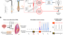 The experiment was conducted with 24 female Sprague–Dawley rats (weights ranging 280–310 g). The rats were anesthetized by inhaling isoflurane (concentrations ranging 3–5%, O2 level: 0.1 L/min). The rats were kept under anesthesia during the implantation of the stimulator and the bladder catheterization procedure. The posterior tibial nerve was exposed on the medial side of the left hind limb above the ankle. The nerve cuff electrode was mounted onto the tibial nerve and the skin was sutured over both the cuff and the stimulator (Fig. 4c,d). The bladder was then exposed by a midline incision on the abdomen, and a catheter inserted via the bladder dome. The opposite end of the catheter was closed off to prevent urinary leakage and fixed under the skin to prevent any possible damage by the rats. Four days later, the catheter was connected to a pump for saline infusion and to a pressure transducer to record bladder contraction and pressure.