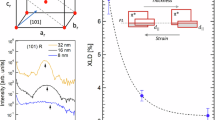 In order to estimate the typical spacing in between adjacent cracks, a fast Fourier transform of the LEEM image has been evaluated (Fig. 4b). The profile along the highlighted path is shown in Fig. 4c, with maxima at \(\pm 4\,\upmu \text{m}^{-1}\) corresponding to a crack spacing of \(\approx 250\,\text{nm}\). Much closer to the theoretical minimal value of \(67\,\text{nm}\) for the given film thickness, one now needs to consider a higher level of stress relaxation due to the formed cracks. As stated above, already for the initial sample state the metal-insulator transition occurs close to the bulk transition temperature of \(340\,\text{K}\), indicating that some epitaxial stress was already released via interfacial defect formation during growth and annealing36. Nonetheless, as-grown samples did not show cracks in AFM (see Supplementary Fig. S3). Hence, considering only a reduced residual stress after annealing may account for the observed larger crack spacing with respect to the theoretical expectations. Although systematic investigations on the dependency of the crack densities on the sample dimensions, strain environments and process parameters are required to fully capture this phenomenon, the present results demonstrate that much higher densities can occur and lead to regular, quasi-periodic arrangements of cracks. Despite the regular appearance of the crack pattern, however, their formation ist still interpreted as an inherently random process: Cracks are assumed to nucleate first at such crystal defects that are located in highly strained sample regions. The propagation of crack lines is terminated at sample imperfections as well, most significantly at pre-existing cracks running in the respective perpendicular orientation. Consequently, the crack lengths are random, with rather long crack lines being created first. As the formation of a crack releases stress from its environment, additional, parallel crack defects will only nucleate beyond a characteristic minimal distance, which subsequently results in the quasi-periodic crack arrangement.