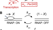 Mouse RNA-seq data were downloaded as fastq files through the NCBI database from SRA ID SRP03618610. Data contained information from 12 different tissues, with 8 time points from each tissue in 6-h intervals over the course of 48 h. Reads were mapped to the Ensembl mouse genome release 95 using STAR 2.7.0a14 with outFilterScoreMinOverLRead = 0.3 and outFilterMatchNMinOverLRead = 0.3 options. We added the option ‘Condensegenes’ to select the most abundant isoform as the representative of a gene, as well as the option ‘count exons’ to measure only mRNA. Baboon circadian transcriptomic datasets were downloaded from series GSE5465012. Reads were mapped to the Ensembl baboon genome (Papio Anubis 2.0) release 90 using STAR 2.7.2b14 with outFilterScoreMinOverLRead = 0.3 and outFilterMatchNMinOverLRead = 0.3 options. The quantification of expression level was performed by HOMER15 using the transcripts per million (TPM) option. Any transcript with an average TPM < 0.5 across all timepoints were eliminated from the downstream rhythmicity analysis. We also used TPM to normalize the expression levels of each transcript. We eliminated white adipose data from the downstream analysis because no transcripts were rhythmic with our statistical threshold (BH. Q-value < 0.05), even though more than 13,500 transcripts were detected after applying the filter of TPM > 0.5. The expression of Per2AS was measured with the “strand-” option in HOMER. We did not apply the filter (TPM > 0.5 to call ‘expressed’) in quantifying the level of Per2AS, because non-coding transcripts generally have low expression levels16,17,18.