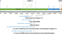 Viral RNA was isolated from cell-cultured SARS-CoV-2, SARS-1, MERS-CoV, hCoV-NL63, hCoV-OC43, hCoV-229E, and from nasopharyngeal swabs from \(n=10\) patients by MagNA Pure LC (Roche Diagnostics, The Netherlands) using the total nucleic acid isolation kit. The RNA was converted into cDNA using SuperscriptIII (Thermo-Fisher Scientific, USA) and random hexamers. Subsequently, conventional PCR was performed on the cDNA using HotStar Taq DNA polymerase (Qiagen, The Netherlands) with 400 nM forward primer (5′-AG CAC TCT CCA AGG GTG TTC-3′) and 400 nM reverse primer (5′-GCA AAG CCA AAG CCT CAT TA-3′) and the following cycling conditions: 15 min at 95\(^\circ\)C, followed by 40 cycles of 1 min at 95\(\,^{\circ }\)C, 1 min at 5 \(^{\circ }\)C and 1 min at 72\(\,^{\circ }\)C. The PCR products were visualized by electrophoresis. The same RNA was used in a diagnostics reference assay by Corman et al.5 and the Cycle threshold values form this reference assay were used for estimating sensitivity.