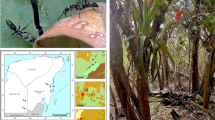 Eighty-two colonies of N. villosa, all of them nesting in the core of a tank-bromeliad A. bracteata (Fig. 1A,B) were collected between January 2016 and April 2018 in several sites in the southern part of the Yucatan Peninsula as part of a larger project53,54. Aechmea bracteata bromeliads were examined for the presence of N. villosa and a ramet of the epiphyte, housing the ants’ colony, was cut off from the supporting branch and dismantled leaf-by-leaf; ants, their brood, and any invertebrate found in the nest were collected and preserved in 96% alcohol.