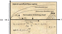 The dimensionless parameters are \({M}^{2}=\frac{2{\sigma }_{f}{B}_{0}^{2}}{a{\rho }_{f}}\), \({Q}_{h}=\frac{Q}{a({C}_{p}{)}_{f}{\rho }_{f}}\), \({\lambda }_{E}=\frac{a{\lambda }_{1}}{x}\), \(\mathit{Re}=\frac{{x}^{n}{\left({U}_{w}\right)}^{2-n}{\rho }_{f}}{{k}_{f}}\) and \(\mathit{Pr}=\frac{({C}_{p}{)}_{f}{\rho }_{f}a{x}^{2}{Re}^{\frac{2}{n+1}}}{{k}_{f}}\). These dimensionless parameters, respectively, are called the Hartmann number, the heat generation parameter, the thermal relaxation parameter (thermal Deborah number), the Reynolds number, and the Prandtl number. The subscripts \(f,hnf,nf,\) stand for fluid, hybrid nanofluid, and nanofluid respectively and \({s}_{1}\) and \({s}_{2}\) stand for solid particles \(Mo{S}_{2}\) and \(\mathit{Si}{O}_{2}\) respectively \(.\)