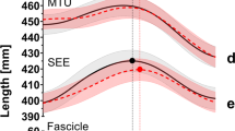 The SEE length (Achilles tendon, aponeuroses and proximal tendon; Fig. 4), was calculated by multiplying the muscle fascicle lengths by the cosine of its pennation angle and then subtracting that value from the MTU length38. Muscle−tendon unit length was calculated by a multiple linear regression equation39 using the participant’s shank length and their knee and ankle joint angles.