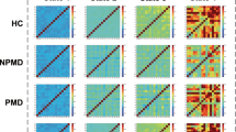 Most PLV connectivity showed mixed patterns, which may imply distinct region-specific activation patterns, even in single frequency bands in a specific disease. These mixed patterns were dominantly observed in MDD and SZ. MDD and SZ are very heterogeneous disease entities among psychiatric disorders30,31. Even in single diagnostic entity, each patient could show a distinct clustering pattern in DMN brain regions31. Our results agree with the previous studies reporting that MDD and SZ exhibited abnormal mixed functional patterns32,33.