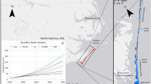 The North Carolina Climate Science Report75 identifies increases in heavy precipitation (very likely), significant SLR (virtually certain), increased hurricane intensity (medium confidence), and required changes in associated engineering design standards (very likely) as ongoing or probable effects of climate change. To quantify expected impacts of SLR, Kopp et al.16 estimated significant increases in the frequency of severe coastal flooding to occur between 2050 and 2100 in North Carolina, depending on RCPs. As a result, $4 and $17 billion of additional coastal properties are expected to experience regular flooding by 2050 and 2100, respectively76. Combining our efforts with findings from such studies suggest that at a decadal timescale, large portions of the region will become unlivable due to more severe and frequent flooding. The results also suggest that even events that provide a glancing blow to the region (Matthew) could have impacts similar to that of a direct hit (Irene) in the future. This is most notable in comparing maximum flood extents in + 74 cm SLR simulations in which the extent of inundated areas converged towards 5000 km2. This suggests topographic characteristics in the region that may slow the growth of at-risk areas in the event of additional SLR. Without substantial investment in coastal resilience, the effects of these factors, accelerated by coastal storm events, is expected to reshape the APES along with its communities and ecosystems. Still, the use of regional-scale VLM changes to project surge risk does not explicitly consider the evolution of coastal features (i.e., dune systems) due to sediment deposition and other factors. These changes can be challenging to accurately predict but remain relevant when simulating local-scale surges37,77. Still, the projected implications here reiterate those detailed in Poultera et al.78, which include additional ecological impacts due to saltwater intrusion, wetland accretion, barrier island section collapse, and loss of waterfront property. Risk reduction policies including investment in engineered protections, relocation programs, and flood insurance should be utilized. The deployment of ecosystem-based approaches such as wetland and dune restoration, beach replenishment, and biogenic reefs are among additional natural solutions with the potential to improve coastal resilience while protecting natural ecosystems79.