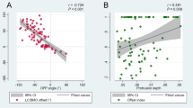 The angular deviation of ASCO offset also showed significant correlations with that of the longest EOB (r = − 0.933, P < 0.001). If we compared the absolute value of correlation coefficient to handle the opposite direction of reference meridian (the nasal horizontal midline was set to zero for the ASCO and CRVT offsets, while the temporal horizontal midline was set to zero for the longest EOB), the angular deviation of ASCO offset showed more correlation with that of the longest EOB than that of CRVT offset (P < 0.001, Williams’ test)27. In contrast to the angular deviations of the longest EOB and the CRVT offset, that of ASCO offset was rarely shifted to the inferior side (Fig. 2D). The multiple regression analysis revealed that the axial length (P = 0.003), the angular deviation of the CRVT offset (P = 0.002), and the meridian of the longest EOB (P < 0.001) were associated with the angular deviation of ASCO offset (Table 3). The association with the meridian of the longest EOB remained significant in the control, glaucoma, and myopia groups when analyzed separately (Supplemental Table 2).