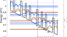 where H0 is the electronic Hamiltonian of a single charge carrier, Φ is the electrostatic potential, D is the sum of all environmental Green’s functions, and Σ denotes the self-energy. Those expressions are implemented in real space basis. The scattering states, the transition probabilities between them and also their occupations are calculated within self-consistent manners. The electric boundary condition is considered. For each scattering forms, inelastic (electron–phonon interactions) and elastic (charged impurity, interface roughness, alloy disorder) scatterings are included. Also, the electron–electron interactions are considered31. More details of scatterings are described in Refs.30,31. In contrast to the NEGF studies in previous reports32,33, the in-plane momentum dependence of the scattering matrix element is employed. For the magnitude of leakages, we tune the cut-off energy with/without the high lying levels, and simply estimate the differences of the total current.