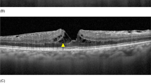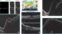 Different types of pathways were not statistically associated with age, gender, laterality, DM type, BCVA at the time of FTMH formation, lens status, MH size, MHRD, FVP severity, FVP activity, CMT, follow-up duration, final BCVA, early and final foveal contours; however, they were significantly associated with the presence of ERM/VMT (p = 0.001), TRD (p < 0.001), LMH (p < 0.001) and foveal thinning (p < 0.001). Predominantly more eyes in type 1 and type 2 groups had ERM/VMT than those in types 3 and 4. On the other hand, much more eyes in types 3 and 4 had TRD. Overall, the edges of FTMH were flat in 15 eyes (71.4%). Flat hole edges were observed in 5 eyes (83.3%), 5 eyes (62.5%), 2 eyes (50.0%), and 3 eyes (100.0%), in types 1, 2 (Fig. 3d), 3 and 4 (Fig. 5d), respectively. Locations, severity and activity of FVP varied in each case (Table 1). In type 1, the severities of FVP from grades 1 to 4 were 16.7%, 66.7%, 16.7% and 0% of eyes, respectively. In type 2, grades 1 to 4 were 37.5%, 37.5%, 25.0% and 0% of eyes, respectively. In type 3, 25.0% of eyes had grade 2 and 75.0% of eyes had grade 3 FVP. In type 4, 66.7% of eyes had grade 2 FVP and 33.3% of eyes had grade 3 FVP. The locations of FVP were incomplete arcade type (83.3%) and central type (16.7%) in type 1, incomplete arcade type (50.0%), followed by central type (25.0%) and widespread type (25.0%) in type 2, incomplete arcade type (75.0%) and complete arcade type (25.0%) in type 3, and complete arcade type (33.3%), incomplete arcade type (33.3%) and widespread type (33.3%) in type 4. Active FVP was found in 2 eyes (33.3%), 1 eye (12.5%), 2 eyes (50%), and 3 eyes (100.0%) in types 1, 2, 3 and 4, respectively. Two of the 3 eyes with spontaneous closure of FTMH belonged to type 2 FTMH formation pathway and FTMH closed spontaneously at 2 and 4 months, respectively. The other one presenting with MHRD belonged to type 1. In this case, the patient preferred not to have surgery, and during follow-up, the retina was reattached and spontaneous closure of FTMH was observed 19 months later. Although statistical investigation of the associated features was not possible because of the small number of cases, eyes with spontaneous closure of FTMH seemed to have better BCVA at the time of FTMH formation (logMAR 0.97 vs. logMAR 1.48) and smaller minimal MH diameter (261 μm vs. 460 μm) when compared to eyes without spontaneous closure of FTMH.