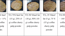 The pH values of beef nuggets were ascertained with a digital pH meter by way of the procedure devised by23. The color of beef nuggets was tested by using the Hunter color (Chromameter, CHROMA-400, Pulsed xenon lamp, 400 nm to 700 nm, Japan) as method of Holmon et al.24. The sensor has 14.0 mm aperture and 45° measuring geometry. Illuminant D65 and 10° standard observer settings were used. The CIE L* (light-ness), a* (redness) and b* (yellowness) values were obtained directly without removing the coating by directly attaching the lens on the surface of the sample. 3 pieces of beef nuggets were measured for each treatment and measured at different locations and this sense 9 data were collected.