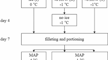 Atlantic salmon (Salmo salar) loins were purchased in a local market just before each experiment. The skin was removed under aseptic conditions, and loins with ca. 60 g were selected (size: 10 cm × 4 cm × 1.5 cm). Loins were selected from two individuals with similar weight (ca. 9 kg) and length (ca. 120 cm) and vacuum-packaged in low-oxygen permeable barrier bags (PA/PE-90; Plásticos Macar–Indústria de Plásticos Lda., Palmeira, Portugal) and sealed under vacuum at − 1 bar of pressure (Vacuum Packaging Machine Culinary, Albipack, Águeda, Portugal). To avoid deterioration, all samples were held on ice, and storage experiments were initiated immediately after sample preparation (within 2 h at most). Storage experiments took place between March and June 2018.