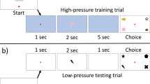 Since monkeys exhibit individual differences49 and different learning speeds, the automatic training control algorithm made it possible to calibrate the training to each monkey’s abilities. In phase 1 of experiment 1, monkey L learned faster than monkey N. Monkey N showed difficulties in step 15 because, in the absence of a stimulus after the “go-signal”, it was unable to understand that it had to take its hand off the touchscreen. We encountered the same difficulty that Berger et al.34 found in a similar step of their protocol with the same requirements (removing the hand from the touchscreen, step 30 in the Berger protocol), and we therefore intervened directly, with the intention of facilitating the continuation of the training. We decided to use an approach that was not completely controlled by the algorithm, since the aim of this study was not to validate a standardized tool or to characterize individual differences34. For these reasons, we decided to remove the steps that required the monkey to take its hand off the screen, allowing monkey N to complete the training. Consequently, our study supports the importance of using an algorithm to enhance learning but also raises a concern about the use of an inflexible, fully automatized process. We believe that to allow the monkeys to overcome some critical steps, the experimenter should be able to act flexibly and intervene when needed, to make the appropriate changes to the training protocol.