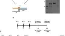 To determine CD4 + and CD8 + lymphocytes sub-populations in antigen re-stimulated splenocytes were washed twice with RPMI and surface staining was performed using antibodies anti-CD3 fluorescein isothiocyanate (FITC) clone 145-2C11 (eBioscience), anti-CD8 peridinin chlorophyll protein (PerCP-Cy5.5) clone 53–6.7 (BD Bioscience), and anti-CD4 Alexa Fluor® 700 clone RM4-5 (eBioscience). For intracellular cytokine staining, cells were incubated with 4.1 µg/mL brefeldin A for the last four hours of incubation. After surface staining cells were fixed and permeabilized with BD Cytofix/Cytoperm (BD, Bio Sciences) and stained with anti-IFNγ allophycocyanin (APC) clone XMG1.2 (eBioscience)59. Samples were acquired on the analyzer LSR Fortessa and at least 100,000 total events were analyzed using FlowJo 8.7 software. Cells were gated on forward and side scatter for lymphocytes, exclusion of viability dye, and singlet populations (Supplementary Fig. 3A–C, respectively). CD3 + (Supplementary Fig. 3D) , CD8 + and CD4 + gates (Supplementary Fig. 3E) were determined based on surface stained cells. Quadrant gating was used to determine the percentage of CD8 + IL-4 + (Supplementary Fig. 3F), CD4 + IL-4 + (Supplementary Fig. 3G), CD4 + IFNγ + (Supplementary Fig. 3H) and CD8 + IFNγ + cells ((Supplementary Fig. 3I). The percentage of antigen specific or total parasite specific cells for each target was calculated by subtracting the percent of media stimulated cells from the percent of antigen-stimulated cells for each mouse. In cases where the antigen stimulated cells was lower than media alone, the percentage is expressed as a negative number.