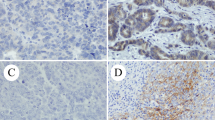 PD-L1 expression was analysed in 194 treatment naïve paired primary EOC and peritoneal metastases tissues using tissue microarray (TMA). Positive expression of PD-L1 in primary tumor and matched peritoneal metastases was 32.5% (63/194) and 45.9% (89/194), respectively. Importantly, the difference in expression of PD-L1 between the primary tumor and paired peritoneal metastases was statistically significant (p < 0.0001) (Table 2, Fig. 1A–D). Among the 63 cases showing positive PD-L1 expression in primary tumor, 43 also had positive expression of PD-L1 in the paired peritoneal metastasis, whereas 20 cases were negative. Of the 131 cases with negative PD-L1 expression in primary tumor, 85 also had negative expression of PD-L1 in the paired peritoneal metastasis and 46 cases were positive for PD-L1 (Table 2). Thus, the concordance rate of PD-L1 expression was 66.0% (128/194). A discrepancy between the primary tumor and metastatic tissue was noted in 34.0% (66/194) cases.